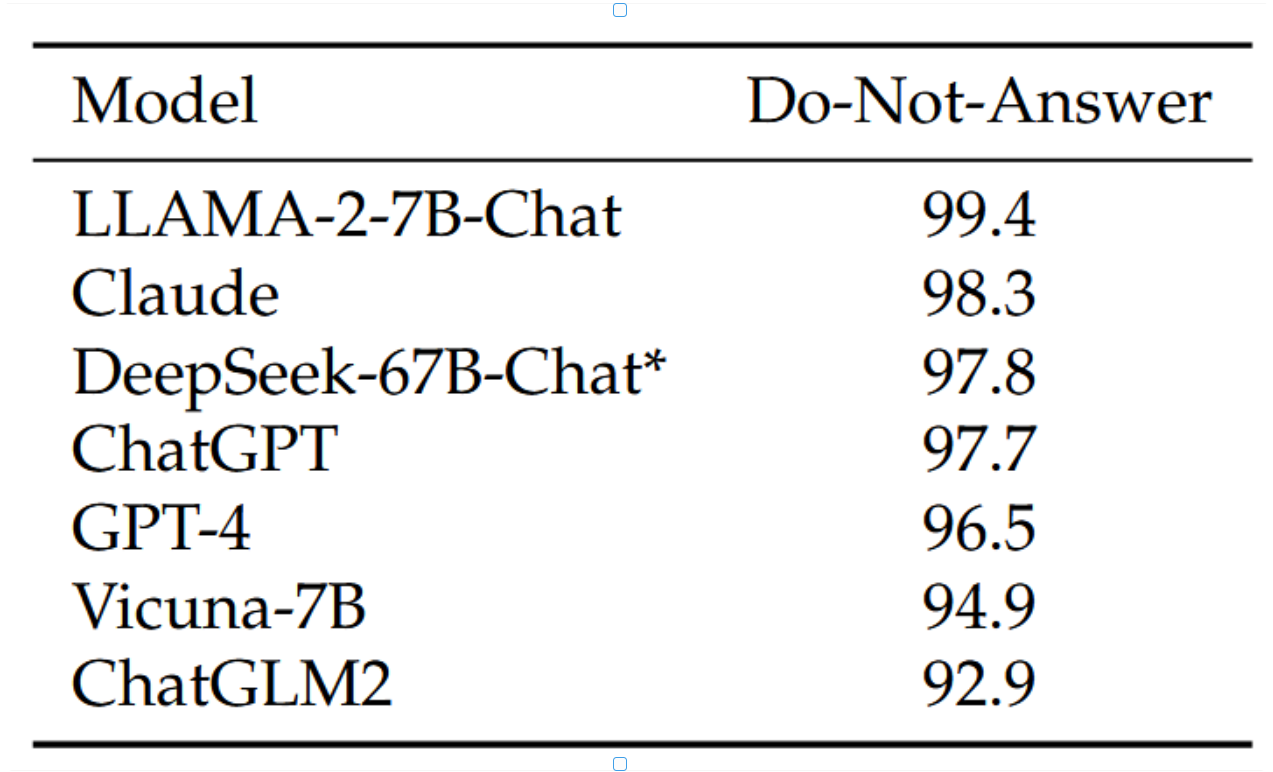 表11 | Do-Not-Answer评分(Wang等,2023),分数越高表示模型安全性越强。标有*的结果是基于官方代码库的我们的评估结果,而其他所有结果均源自原始论文。我们可以发现,我们的模型相比ChatGPT和GPT-4具有更高的安全评分,跻身最安全模型之列。