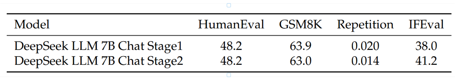 表12展示了从两阶段训练过程中获得的结果。这些结果清楚地表明,第二阶段在降低重复行为并增强指令遵循能力的同时,并未损害模型在代码和数学方面的熟练程度。