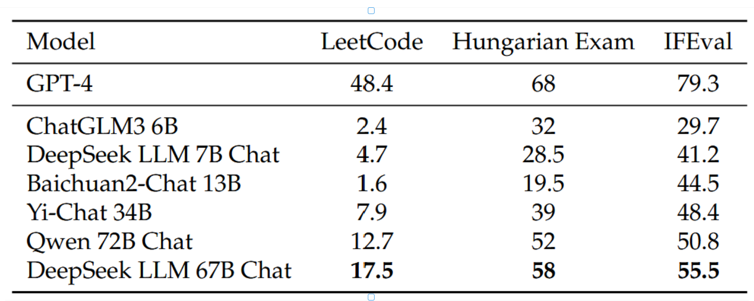 我们对本模型与多种不同规模的基线模型进行了比较分析,这些模型包括Qwen 72B Chat (Bai et al., 2023)、ChatGLM3 (Du et al., 2022)、Baichuan2 (Yang et al., 2023)以及Yi-34B Chat。观察结果表明,在这些保留数据集上,大型模型与小型模型之间存在显著的性能差距,即便某些小型模型在传统基准测试中取得了令人瞩目的成绩。例如,ChatGLM3在代码测试集MBPP上得分为52.4,接近DeepSeek 67B;然而,在新基准评估中,其性能远不及DeepSeek 67B。数学数据集上也呈现出类似趋势:ChatGLM3在GSM8K上表现强劲(72.3),但其匈牙利考试分数却逊于大型模型。此外,指令跟随能力表明,总计算量起着至关重要的作用。