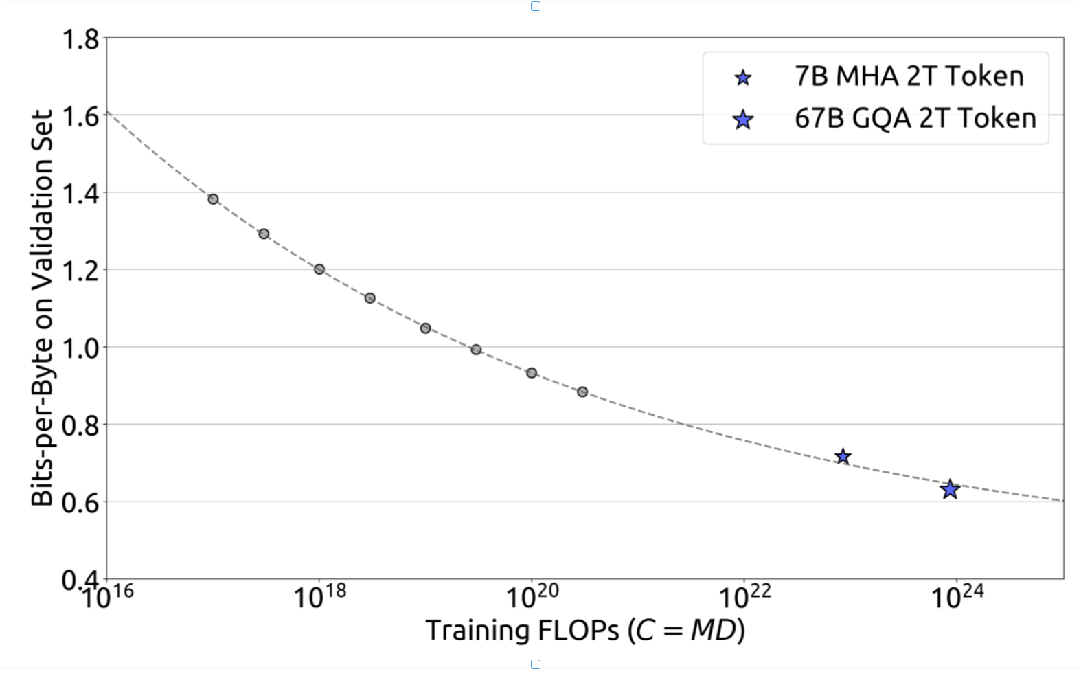 图5 | 性能缩放曲线。指标为验证集上的每字节比特数。虚线表示拟合较小模型(灰色圆圈)的幂律。蓝色星标代表DeepSeek LLM 7B和67B。它们的性能可由缩放曲线很好地预测。