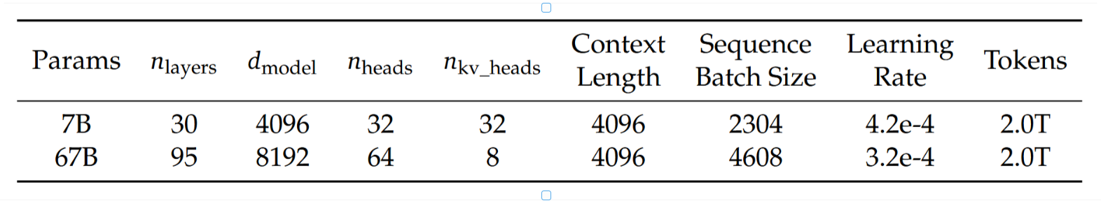表2 | DeepSeek大语言模型系列详细规格说明。我们根据第3节的研究结果选择超参数。