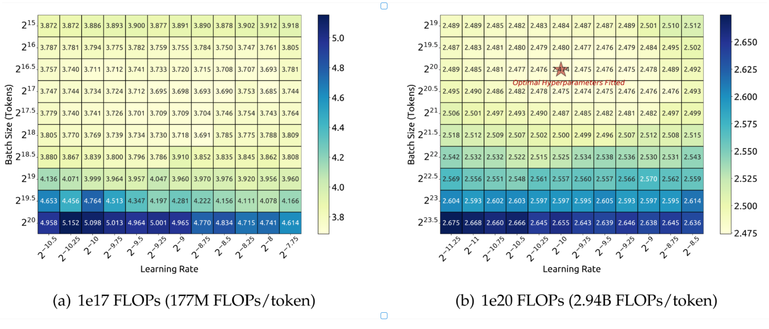 图2 | 训练损失与批量大小和学习率的关系(使用1e17和1e20 FLOPs)。