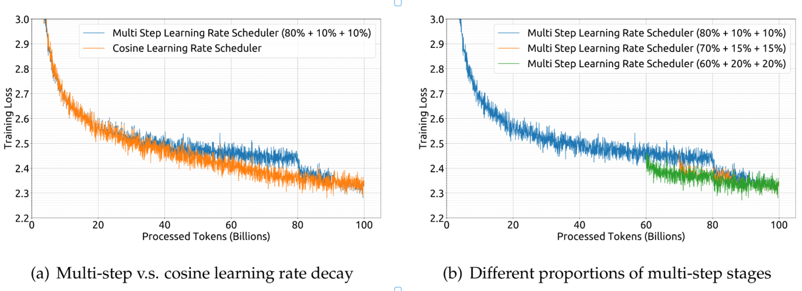 根据我们的实证研究结果,我们观察到尽管损失减少方面存在差异在训练过程中,多步长学习率调度器的最终表现与余弦调度器基本一致,如图1(a)所示。当保持模型规模不变而调整训练规模时,多步长学习率调度器允许复用第一阶段的训练,这为持续训练提供了独特便利。因此,我们选择多步长学习率调度器作为默认设置。我们在图1(b)中也展示了,调整多步长学习率调度器中不同阶段的比例可以获得稍好的性能。然而,为了平衡持续训练中的复用率与模型性能,我们选择了前述三阶段按80%、10%和10%的比例分布。