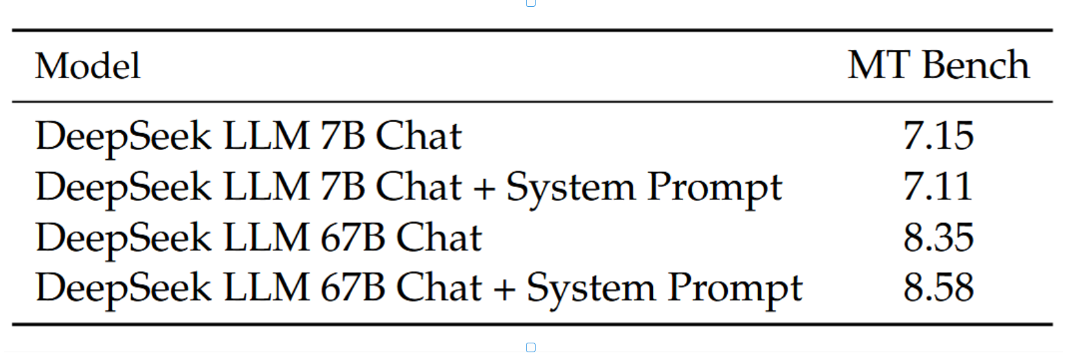 我们观察到一个有趣的现象:当引入系统提示时,7B大语言模型的性能会出现轻微下降。然而,当使用67B大语言模型时,添加提示则能显著提升结果,如表14所示。我们对这一差异的解释是:较大的模型能够更好地理解系统提示的潜在意图,从而更有效地遵循指令并生成更优的响应。相反,较小的模型难以充分理解系统提示,训练与测试之间的不一致性可能对其性能产生负面影响。