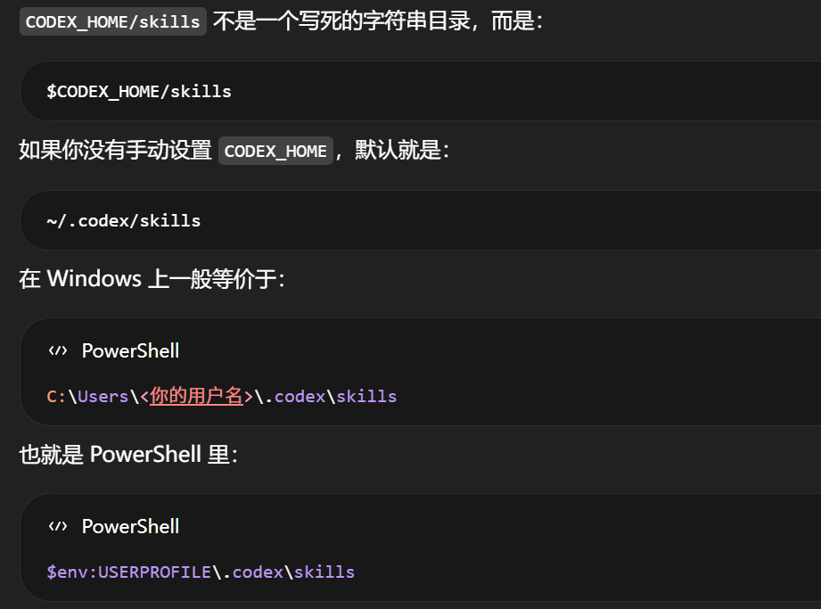 GitHub issue 里有人提到 Codex 当前用户 skills 看起来主要从 $CODEX_HOME/skills 加载,默认是 ~/.codex/skills;如果你把 skills 放到别的目录,比如 ~/.agents/skills,可能不会被自动加载。