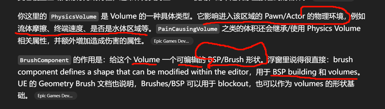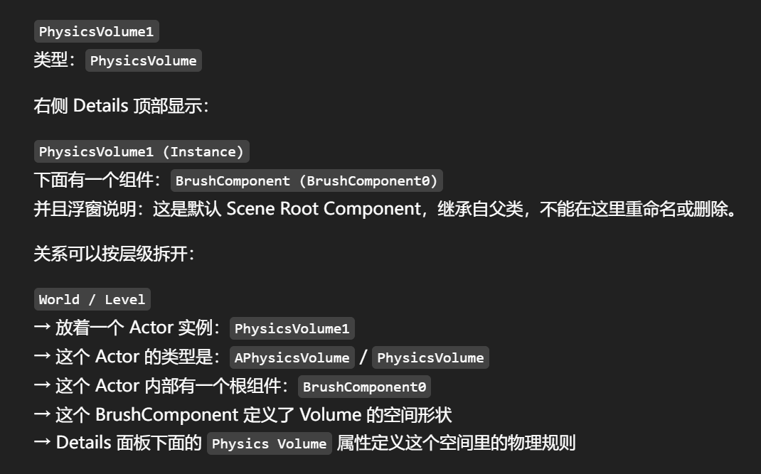 Volume 必须有一个"区域"。没有区域,引擎就不知道什么时候 Actor/Pawn 算是进入这个 PhysicsVolume。BrushComponent0 就是这个区域的几何边界。进入这个边界后,PhysicsVolume 的属性才有意义。