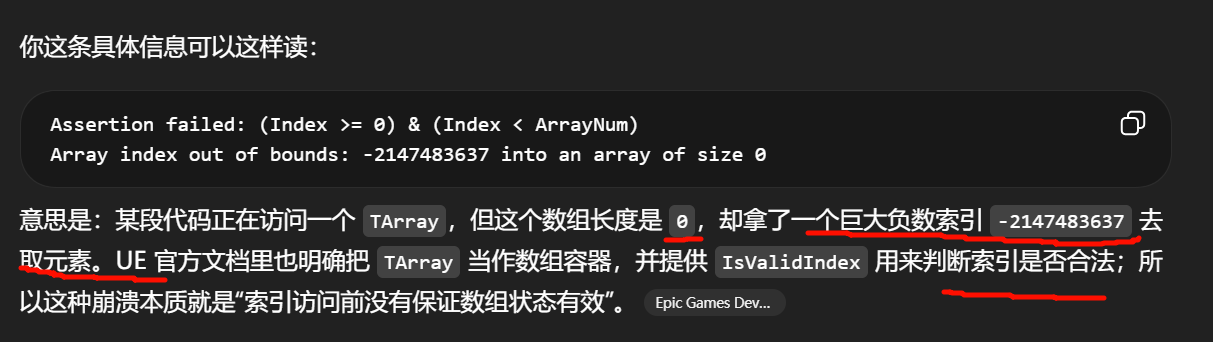 上层某个系统把非法状态传给了底层容器,底层 TArray 做边界检查时主动崩溃。