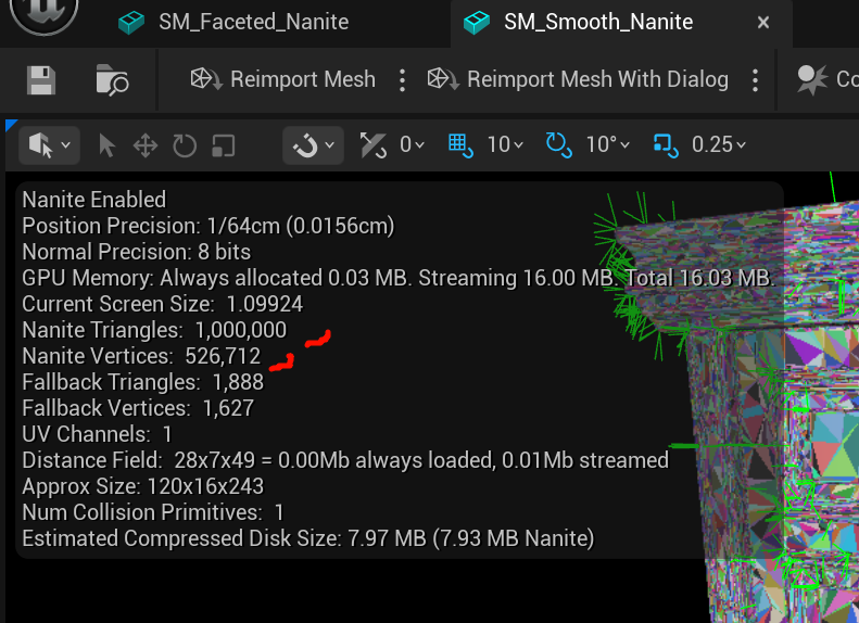Smooth 版本是 100 万 Nanite 三角形、约 52.6 万 Nanite 顶点;