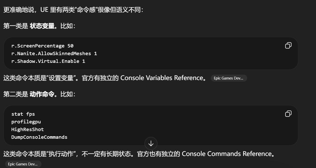 Console Variables/Commands 可以通过控制台或 -ExecCmds 方式执行。