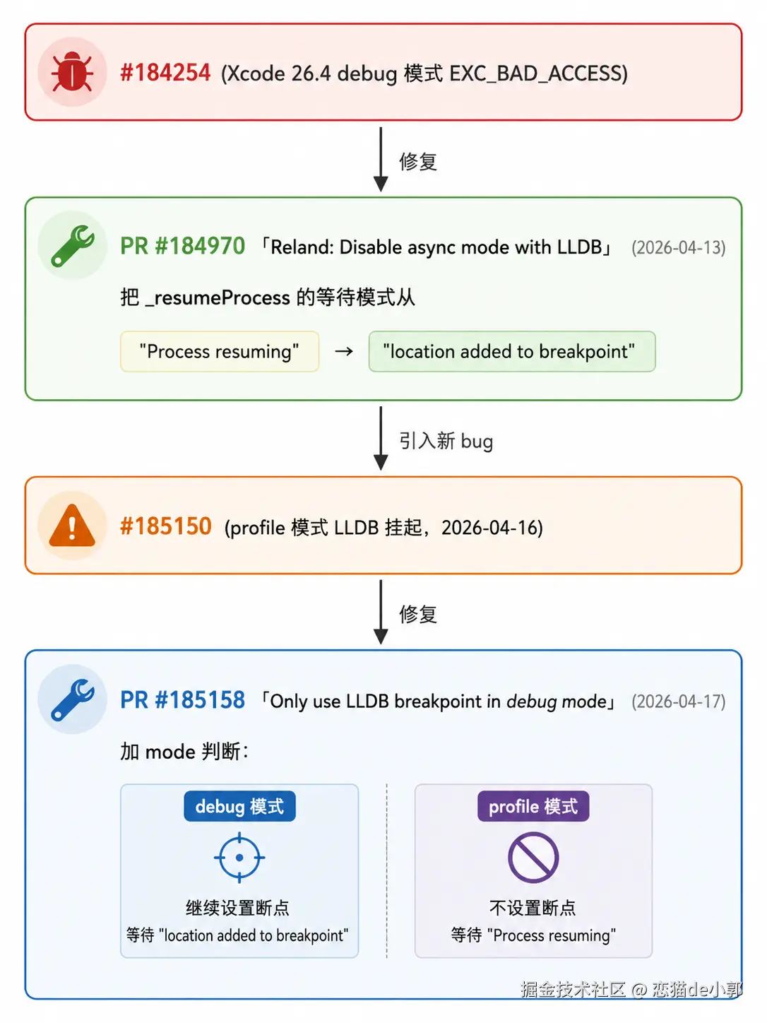 笑死,在不久之前 3.41.7 iOS 大修复我们才聊过,Flutter 官方终于修复了 iOS 26.4 的 JIT Debug Crash 问题,这个问题是因为它有一个上游 bug(llvm/llvm-project#190956),在异步模式(async mode)下,LLDB 会随机失败去重新装填(rearm)脚本化断点。