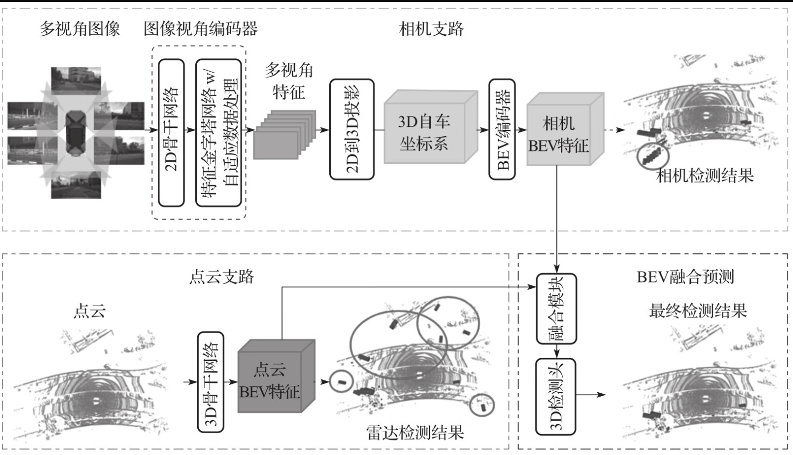 - 细节:图中显示相机支路也可以独立输出检测结果。这通常作为一种辅助监督,帮助图像支路训练得更好,或者在雷达失效时作为降级方案。