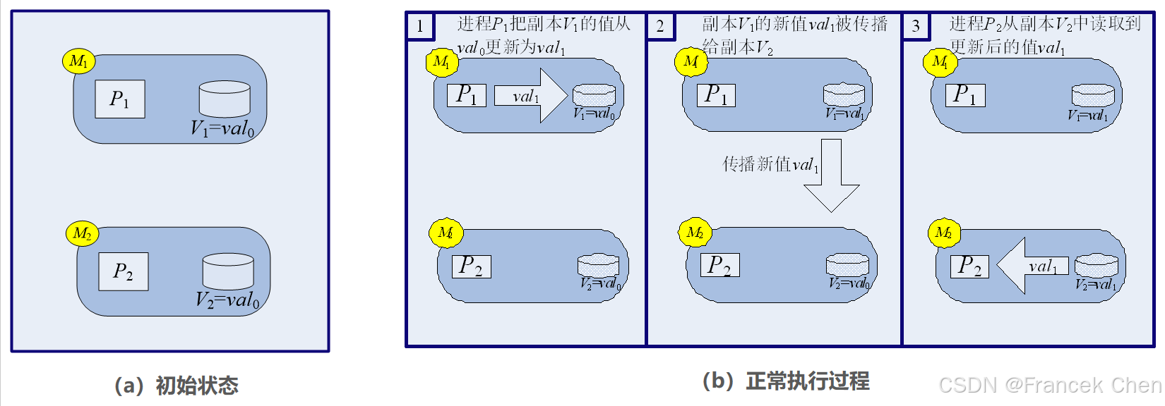 (1)进程 P 1 P_1 P1 向节点 M 1 M_1 M1 的副本 V 1 V_1 V1 写入新值 v a l 1 val_1 val1。