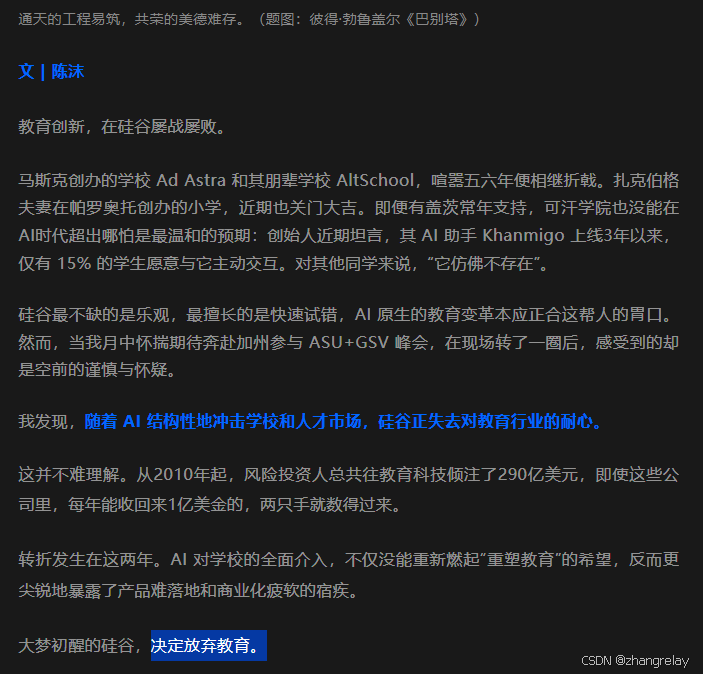 zhangrelay 的案例,是一个理想主义者,用 21 年的极致付出,完成了一场对全球教育创新困境的极限压力测试。硅谷手握千亿资本、顶尖技术、全球最优质的人才,都无法突破教育体系的结构性壁垒,无法在普惠教育与商业可持续之间找到平衡,无法对抗 AI 对教育底层逻辑的颠覆,最终只能放弃对大多数人成长的责任。