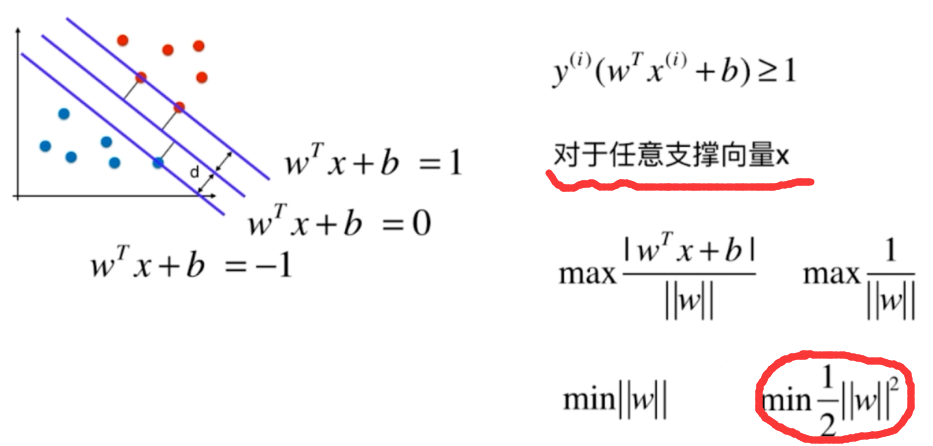 - 所有训练数据点距离最优分类超平面的距离都要大于支持向量距离此分类超平面的距离