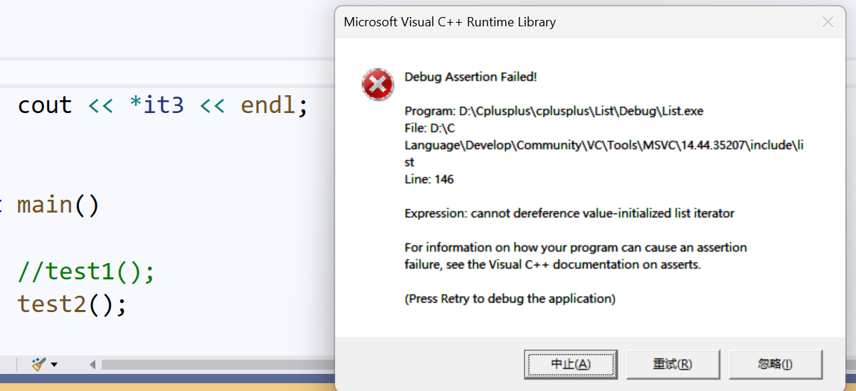 但是删除后,迭代器it2失效了,因为erase()删除的本质,是释放指定节点的空间。此时vs2022环境下会报警告: