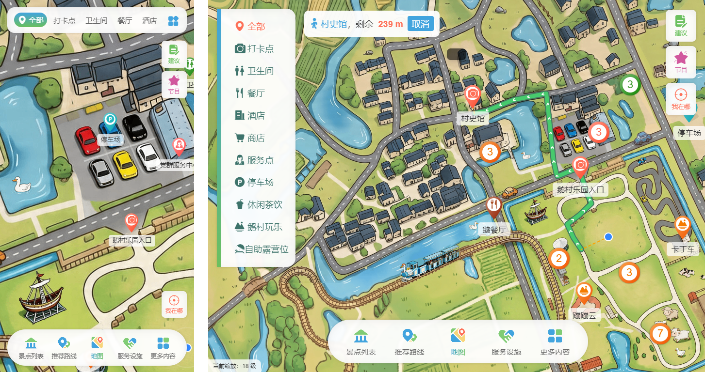 鹅村使用本文讲述的 卫星影像 + AI手绘 + ebmap Tour 的方案,一周就完成了从立项到上线的过程。智慧导览系统包含:Q版手绘地图、实时定位、景点点位标注、语音讲解、智能寻路、智慧节目单、投诉建议等,实现较低成本落地功能完善、体验优秀的 "鹅村小地图"智慧导览系统。
