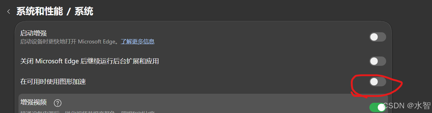 关闭 "在可用时使用图形加速" → 重启 Edge(一定要重启)