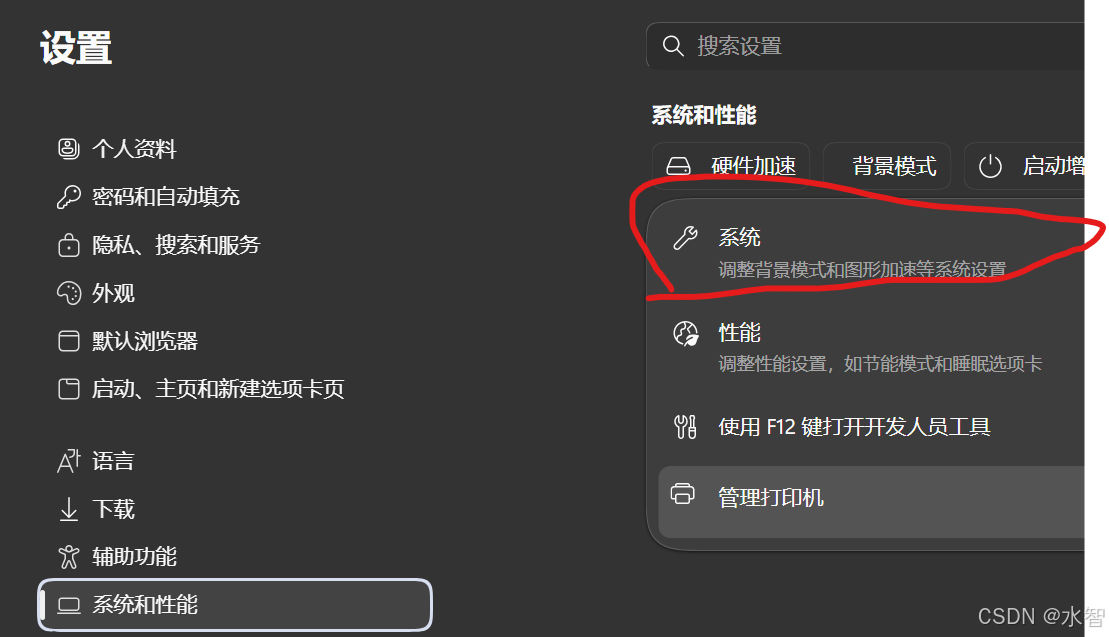 Edge 右上角 "⋯" → 设置 → 系统和性能 → 系统