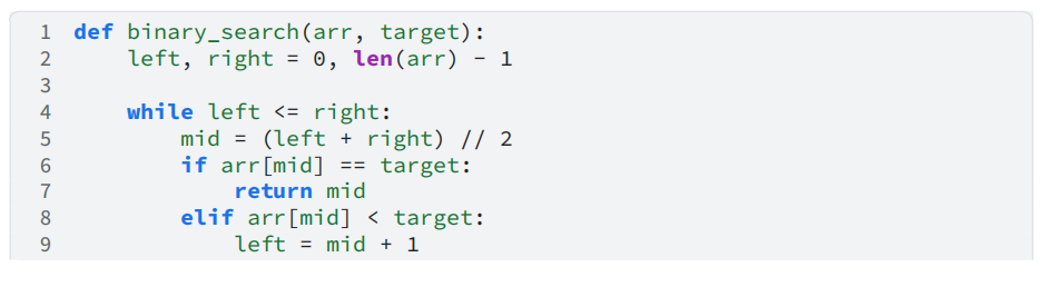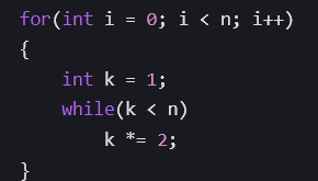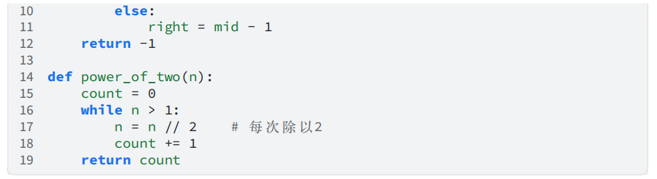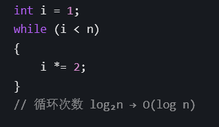 上述代码中,每次将问题规模缩小一半,循环次数为 log2 𝑛,时间复杂度为 𝑂(log 𝑛)。