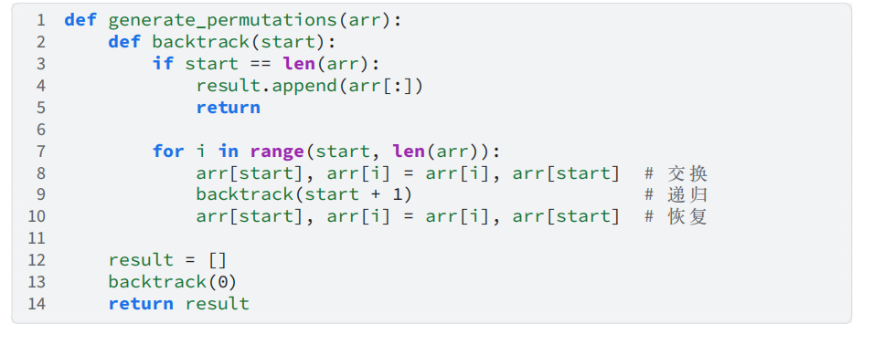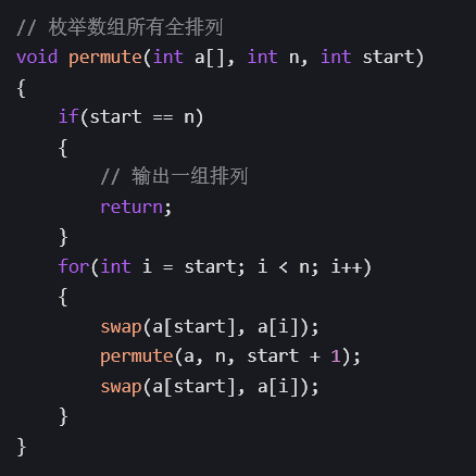 上述代码中,generate_permutations 函数通过回溯法枚举所有排列。每一层递归会将当前位 置与后续每个元素交换,递归深度为 𝑛 层。第 1 层有 𝑛 种选择,第 2 层有 𝑛 − 1 种选择,依此类推,