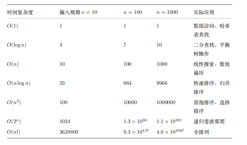 常见时间复杂度从小到大排序:𝑂(1) < 𝑂(log 𝑛) < 𝑂(𝑛) < 𝑂(𝑛 log 𝑛) < 𝑂(𝑛^2 ) < 𝑂(𝑛^3 ) < 𝑂(2^𝑛) < 𝑂(𝑛!) < 𝑂(𝑛^ 𝑛)