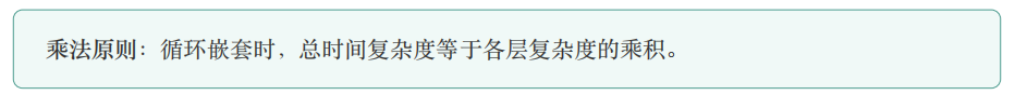 两层嵌套循环,每层执行 𝑛 次操作的算法,时间复杂度为 𝑂(𝑛^2 )