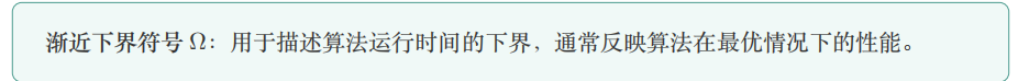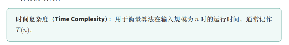 时间复杂度通常记作 𝑇 (𝑛) = 𝑂(𝑓(𝑛)),称为 渐近时间复杂度(Asymptotic Time Complexity),用 于描述当问题规模 𝑛 趋近于无穷大时,算法运行时间的增长趋势。我们常用渐近符号(如 𝑂、Ω、Θ 等)来表达这种增长关系。渐近时间复杂度只关注主导项,忽略常数和低阶项,从而简洁地反映算法的本质效率。