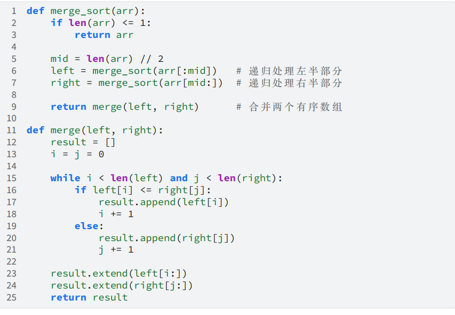 上述代码中,merge_sort 函数采用了分治思想,每次递归将数组一分为二,递归深度为 log2 𝑛