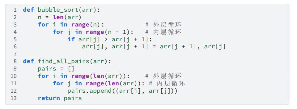 上述代码中,每个函数都包含两层嵌套循环,总操作次数为 𝑛^2,时间复杂度为 𝑂(𝑛^2 )