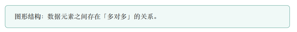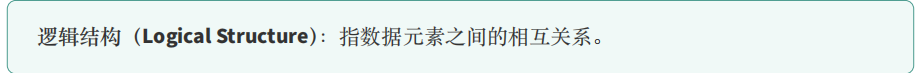 • 逻辑结构 :描述数据元素之间的关系,主要包括:集合结构 、线性结构 、树形结构 和 图形结构 。