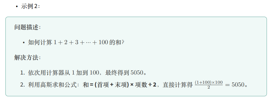 上述三个示例中的解决方法都属于【算法】 。从上海到北京的出行方案是一种算法,对 1 到 100 求和的 方法是一种算法,对数组排序的方法同样是一种算法。可以看出,对于同一个问题,往往存在多种 不同的算法可供选择