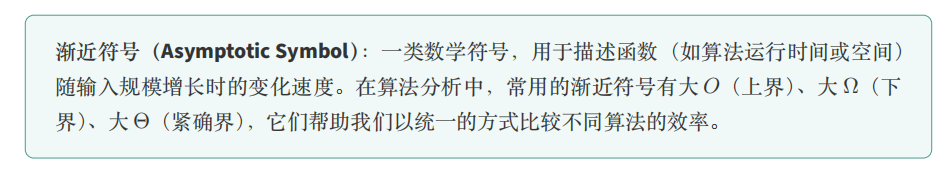 所谓「算法执行时间的增长趋势」, 实际上就是类似 𝑂 这样的渐近符号,来简洁地描述算法随输入规模变化时的资源消耗情况。