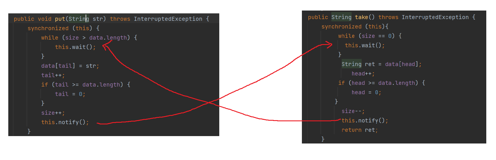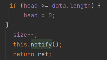 对于此处size是不会出现0情况,正常来说 wait 的唤醒是通过另一个线程执行 put 另一个线程 put