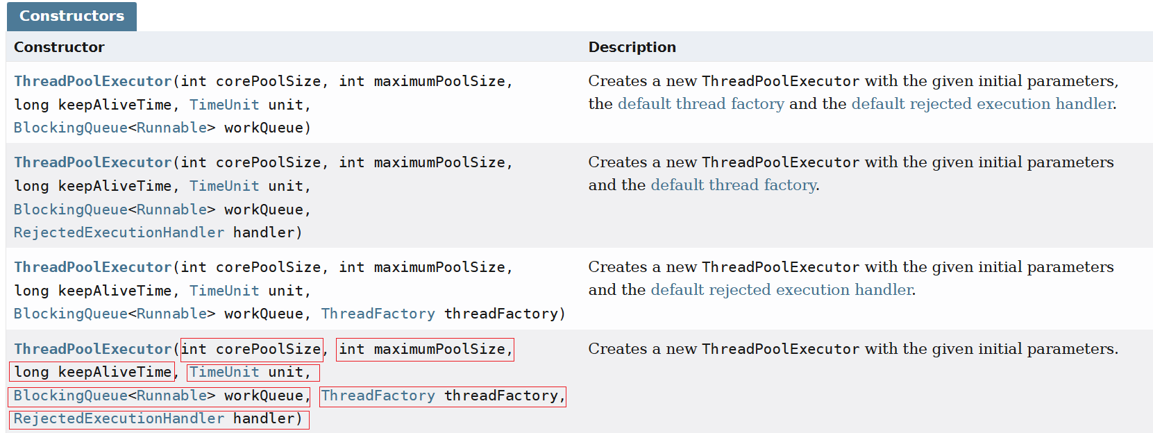对于ThreadPoolExecutor这个类有四种构造方法,我们可以通过了解最后一个(即次数最多的一