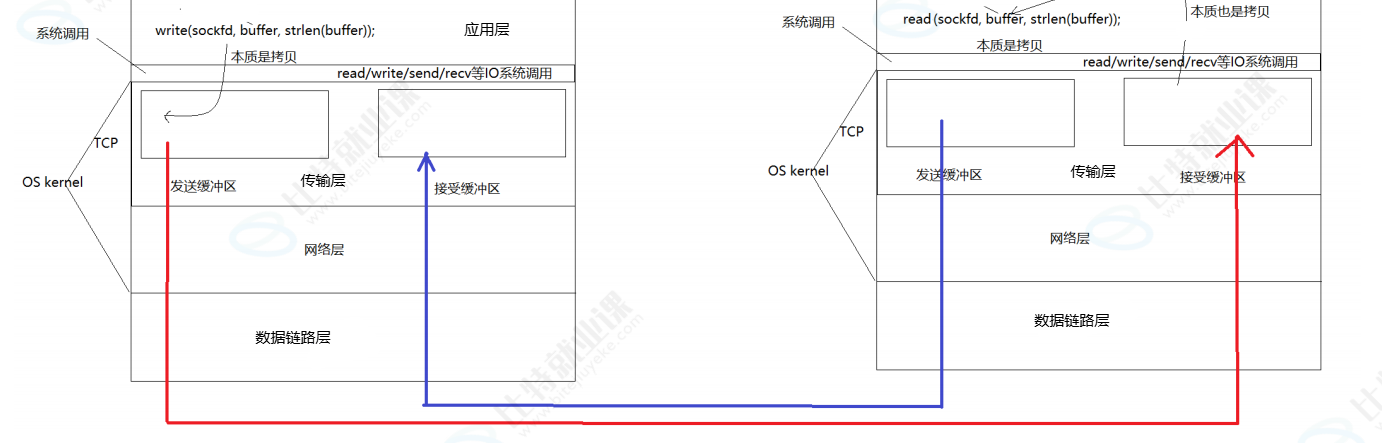 TCP 通信中,应用层的 write、read 阻塞本质上就是典型的生产者 - 消费者模型:对于 write 发送数据来说,应用进程是生产者,TCP 内核协议栈是消费者,应用进程通过 write 将用户态数据拷贝到内核发送缓冲区(生产行为),TCP 内核协议栈则负责将缓冲区中的数据封装协议头并发送到网络(消费行为),当应用进程生产速度过快、TCP 消费速度过慢,导致内核发送缓冲区被填满时,生产者(应用进程)就无法继续往缓冲区写入数据,此时 write 就会阻塞;而对于 read 接收数据来说,TCP 内核协议栈是生产者,应用进程是消费者,TCP 协议栈将网络中收到的数据存入内核接收缓冲区(生产行为),应用进程通过 read 从接收缓冲区拷贝数据到用户态(消费行为),当 TCP 生产速度慢、应用进程消费速度快,导致内核接收缓冲区为空时,消费者(应用进程)就无法读取到数据,此时 read 就会阻塞,这就是write、read 因内核缓冲区满或空而发生阻塞的底层本质。