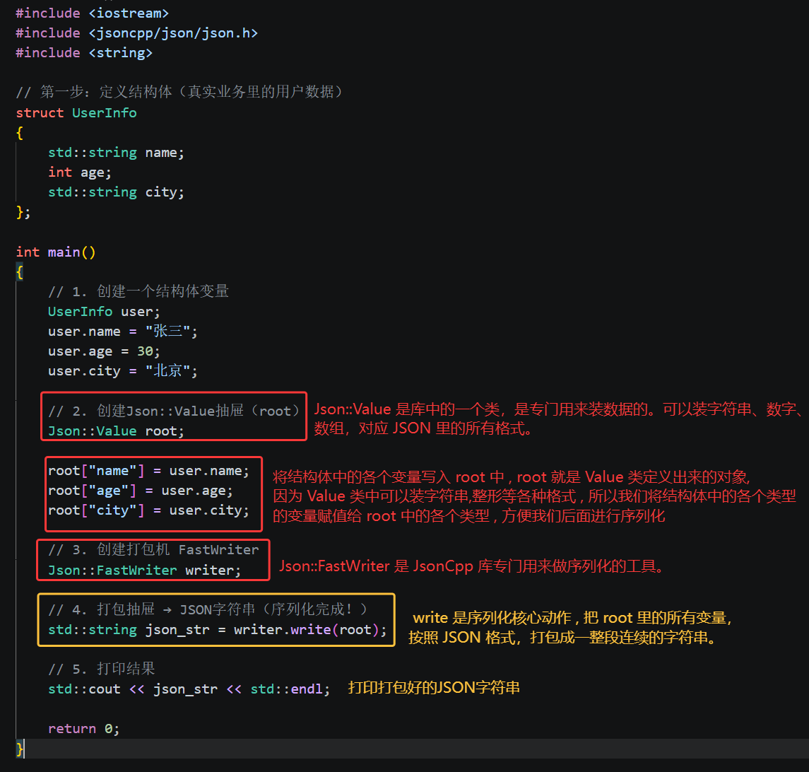 Json::Value 是库专门用来装数据的类。它是 JsonCpp 库自带的一个 "万能容器",它能接收 C++ 里所有常用类型(int、string、bool、数组、嵌套结构体);但是 JsonCpp 库只认 Json::Value 这一种格式,不认我们自己定义的 struct、class;所以在进行序列化之前必须先把我们的结构体转换到 Json::Value 定义的对象中,再转换为 JSON 字符串。相当于一个"中转站"。