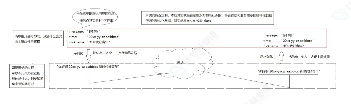 这种分散且多类型的结构化数据,本身是无法直接放进我们约定好的应用层自定义协议的格式中、也无法适配网络传输 ------ 网络只认连续的二进制字节流,不识别结构体、成员变量这些上层业务概念。