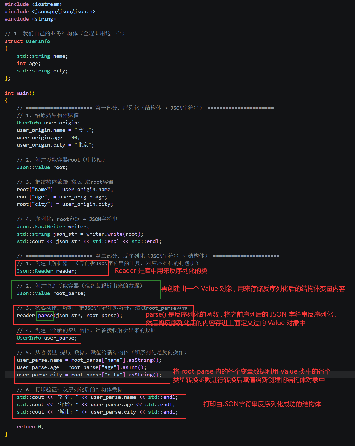 - 反序列化:把网络收到的 JSON 字符串,解析还原成 C++ 可直接操作的变量、对象。
