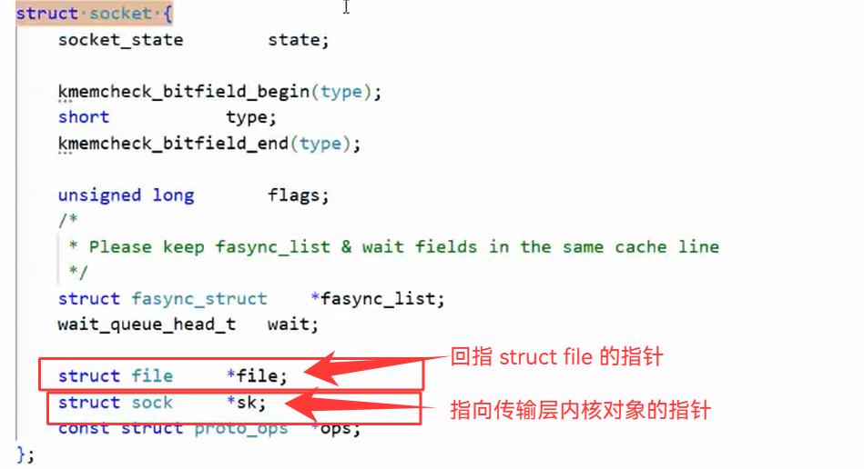 我们调用 socket() 创建网络套接字时,内核也会创建一个 struct socket 结构体,在 struct socket结构体中,有两个最核心的指针,一个是 struct file *file 回指指针,指向上面的 struct file 结构体。