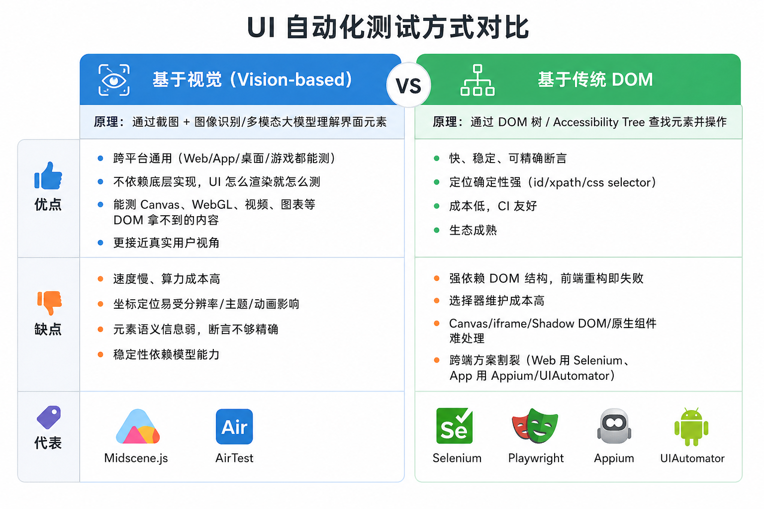在开始讲自动化测试Skill之前,咱们先来对比一下UI 自动化测试实现方案,目前UI自动化测试主要有基于视觉和传统DOM 两种方式
