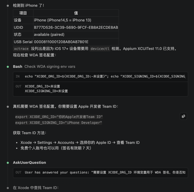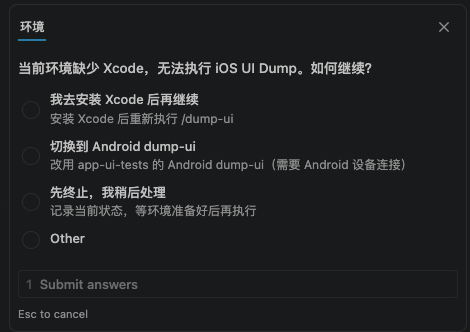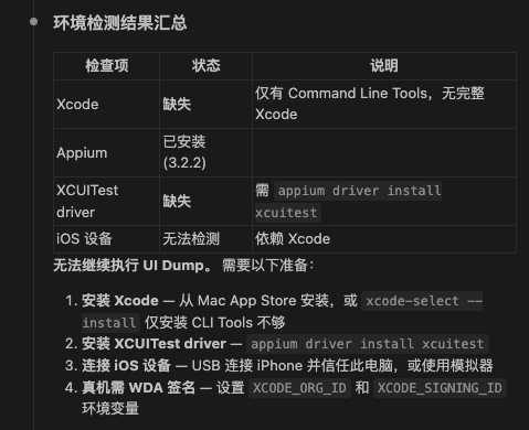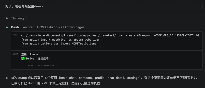 不过不用害怕,以上完整搭建步骤和踩坑经验,都已经写在dump-ui-ios Skill里面了,加载Skill后,使用Claude Code 等AI编程工具会跟你对话提示,自动安装好所有的环境依赖,中途遇到问题AI也会自助解决,下面以Claude Code 对话为例演示Skill使用过程