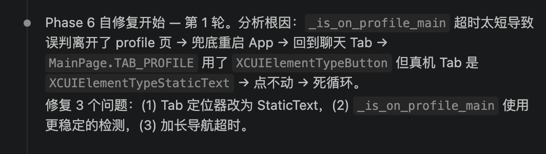 真机运行第一轮自动化测试脚本后,Skill里面定义了自修复环节,模型会针对失败的用例进行调整和修复