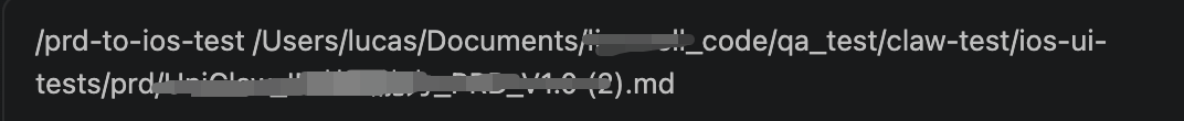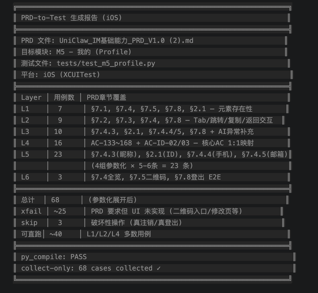 前置页面Dump已经完成,我们现在已经有被测APP全部页面的Dump信息,现在调用/prd-to-ios-test skill 去生成自动化测试用例