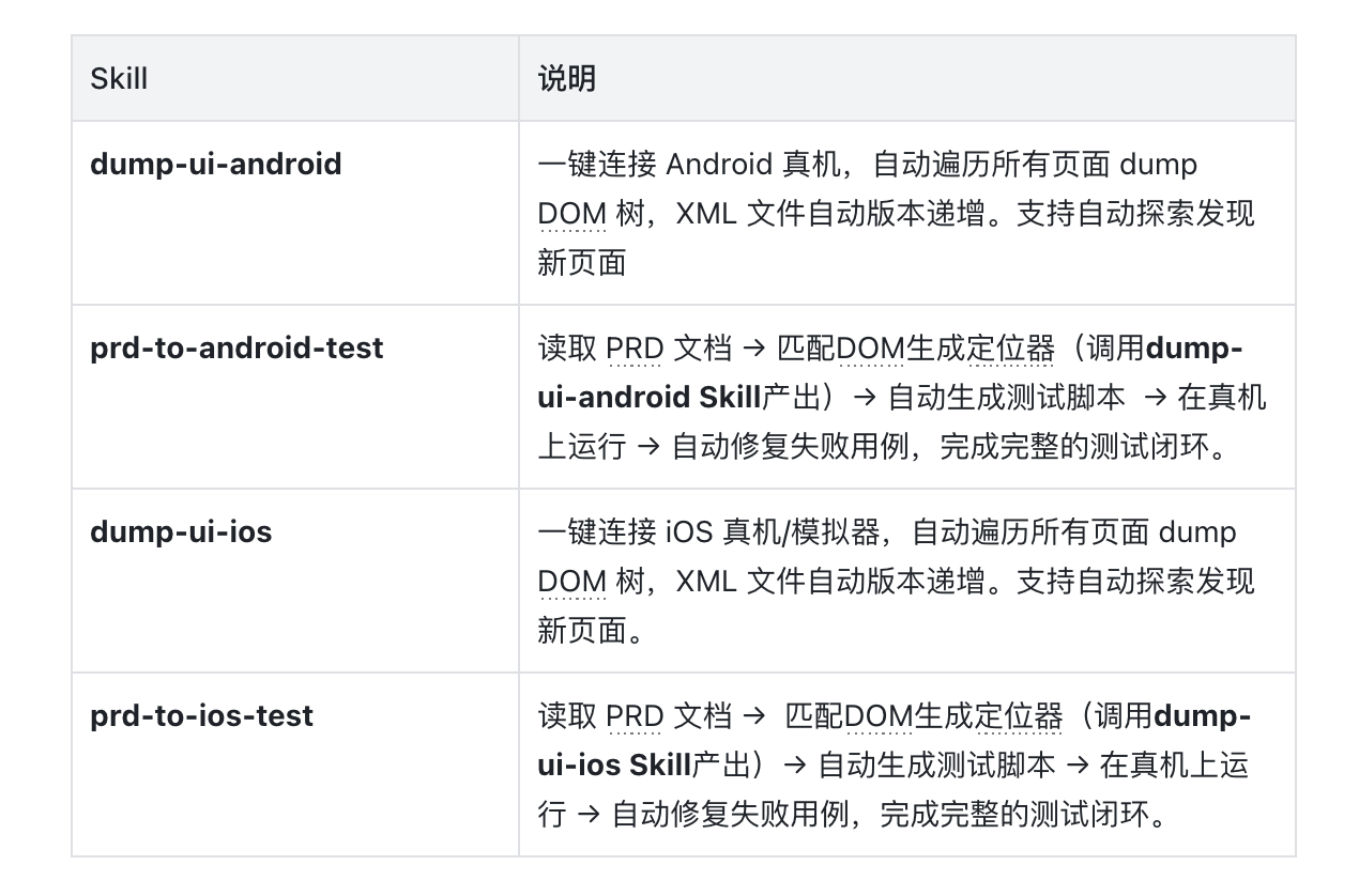 目前我是实现了4个APP 自动化测试Skill,执行安卓APP自动化测试使用dump-ui-android,pro-to-android-test这两个Skill,执行IOS APP自动化测试使用dump-ui-android,pro-to-android-test