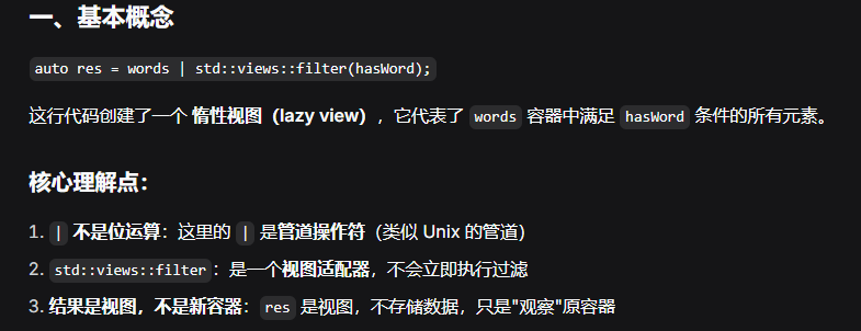 (3)范围适配器:返回视图的函数或对象。它们是构建数据处理管道的基本单元,通过管道符 | 进行组合,数据从左向右流动,逻辑清晰直观。