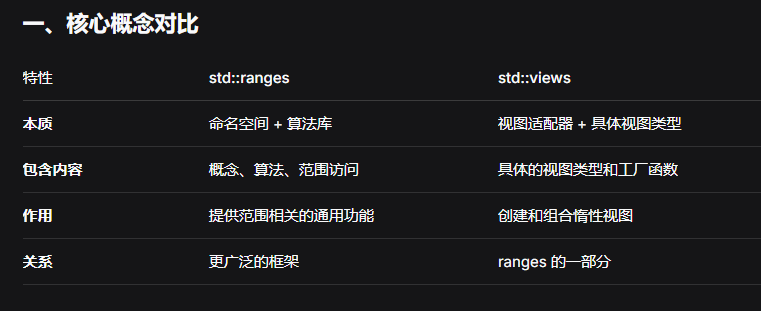 核心概念,Ranges库建立在几个相互关联的核心概念之上: