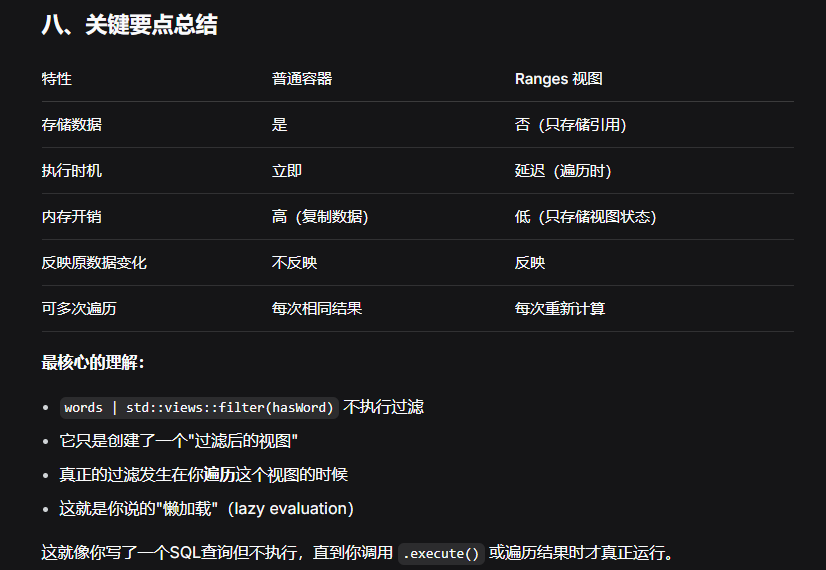 (2)视图:一个轻量级的、非持有的范围,它不会复制数据,而是对底层数据进行某种操作(如筛选、转换等)并提供一个"视图"。视图的计算是惰性的,即只有在需要时才计算,这为性能优化提供了巨大空间。