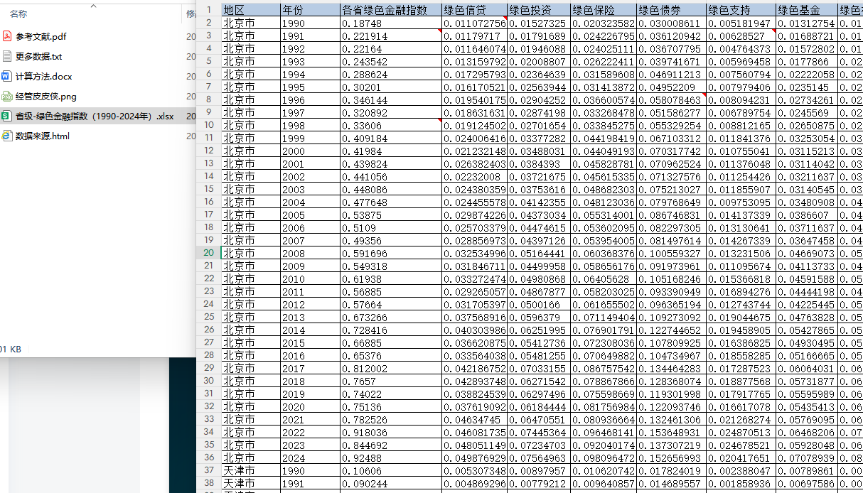 数据集包含以下核心指标:地区、年份、绿色金融指数及其构成部分------绿色信贷、绿色投资、绿色保险、绿色债券、绿色支持、绿色基金、绿色权益。这些指标共同构成了衡量省级绿色金融发展水平的全面框架,为政策制定、学术研究及市场分析提供重要参考。