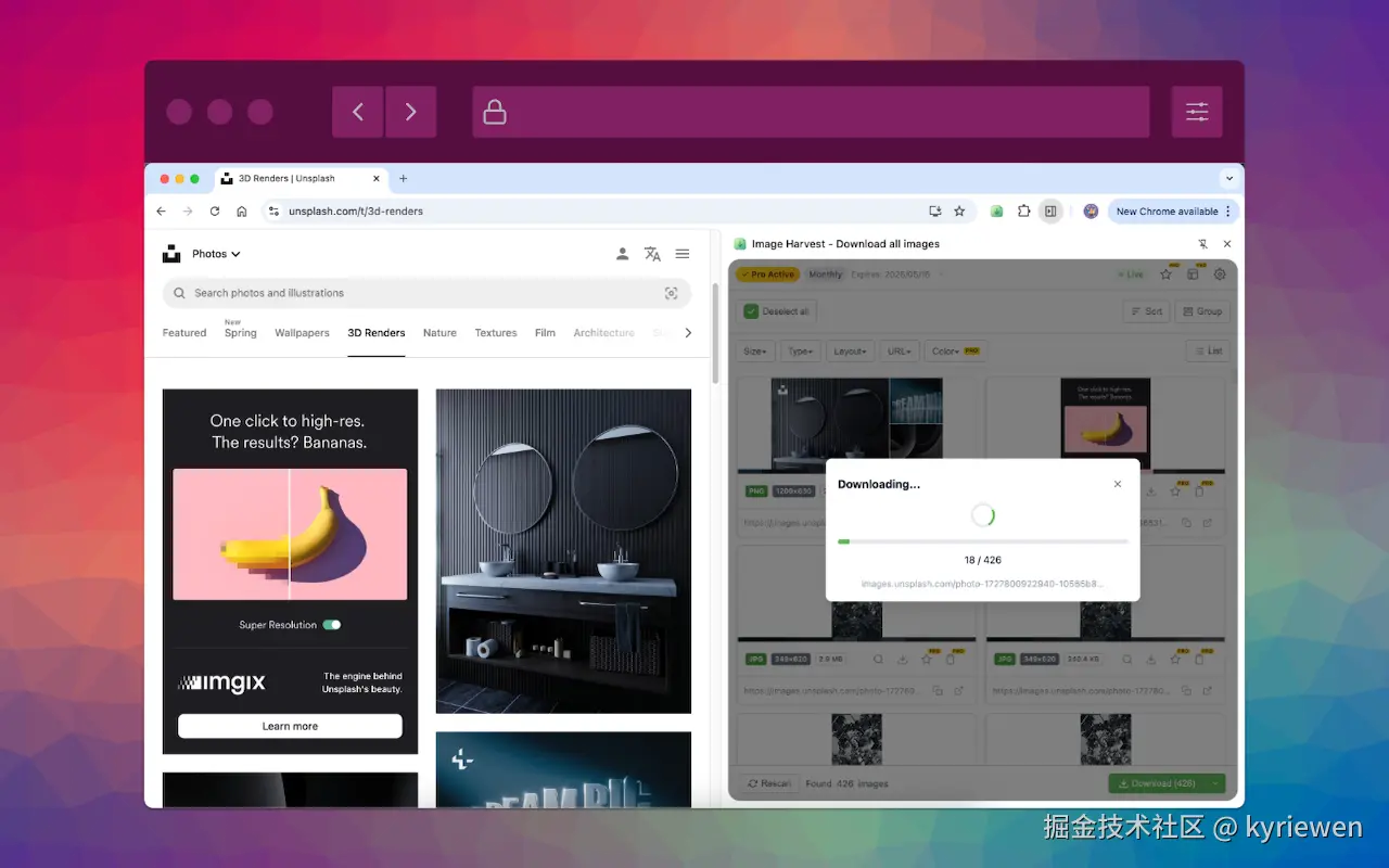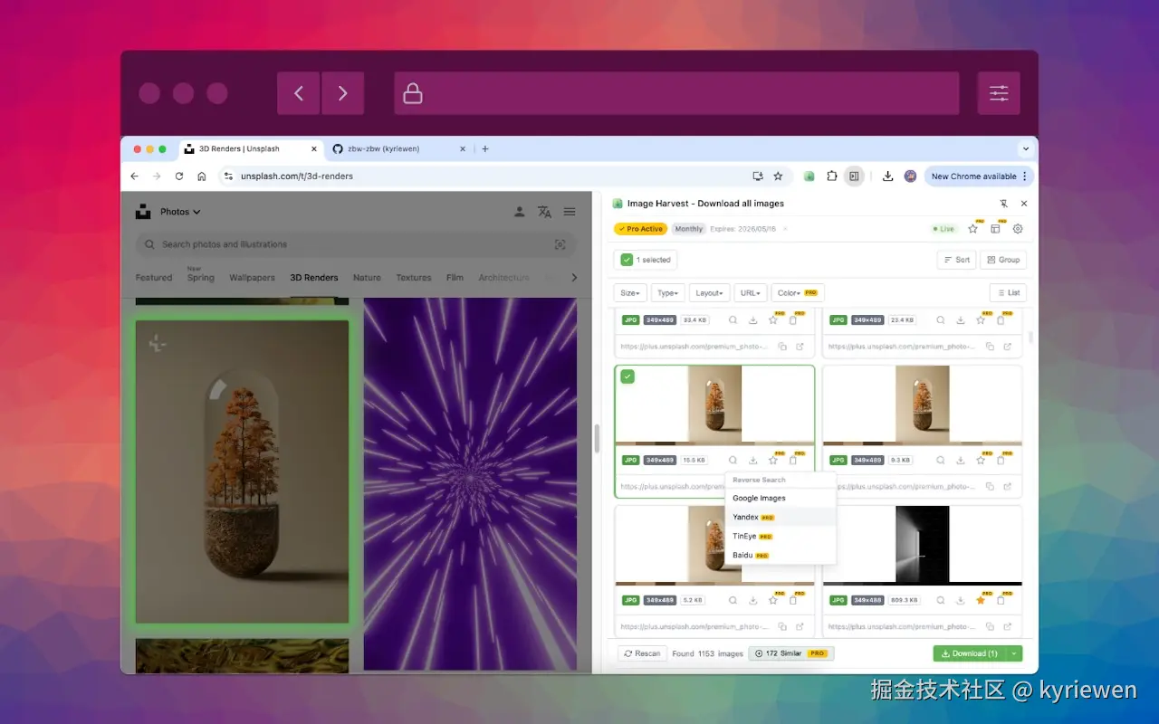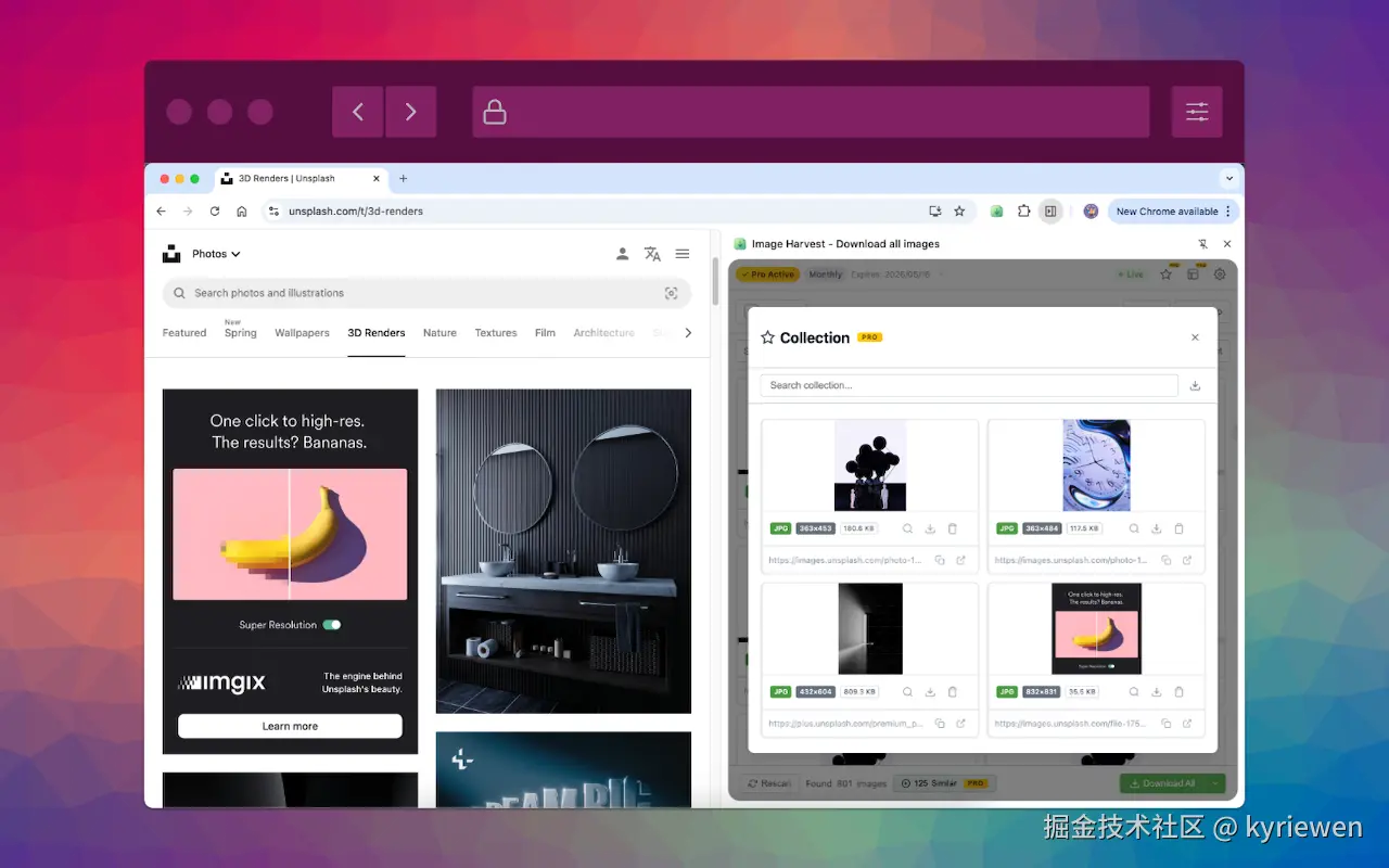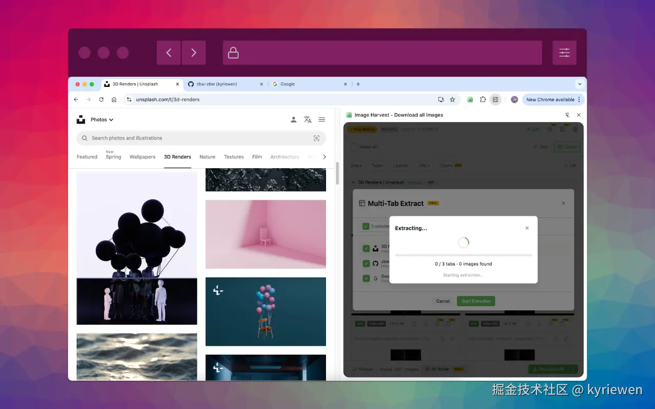 于是我自己写了一个 ------ Image Harvest 。它能把网页里所有图片(包括 <img>、CSS 背景、iframe 内嵌、甚至 Shadow DOM 里的)全部扒出来,一键打包 ZIP,而且本地处理,零追踪。