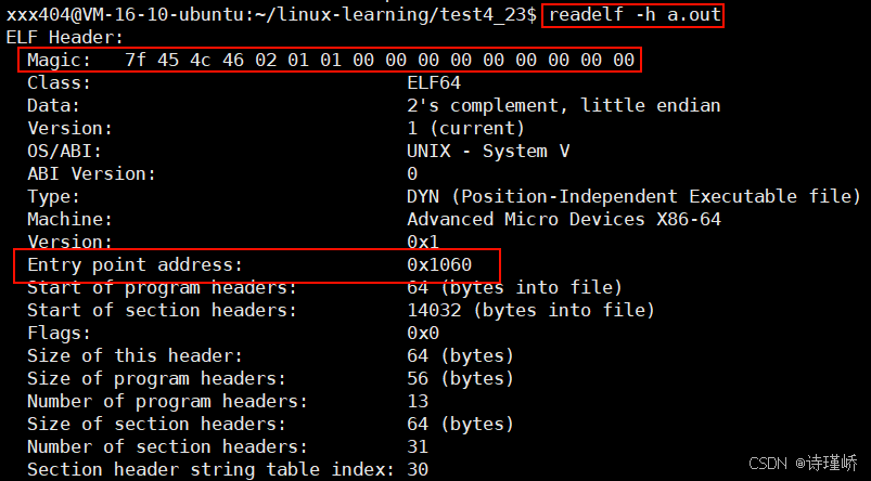 Magic: 7f 45 4c 46 02 01 01 00 00 00 00 00 00 00 00 00 # ELF⽂件标识符(魔数)